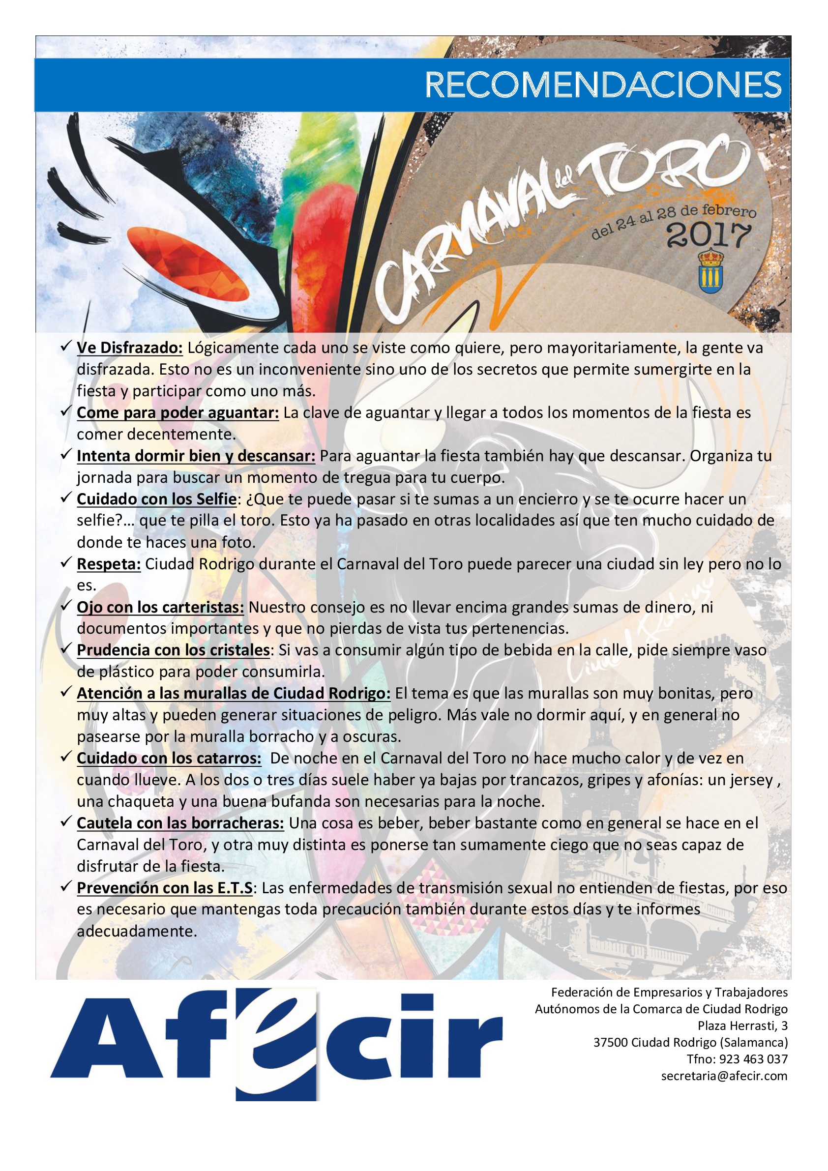 RECOMENDACIONES PARA EL CARNAVAL DEL TORO DESDE AFECIR