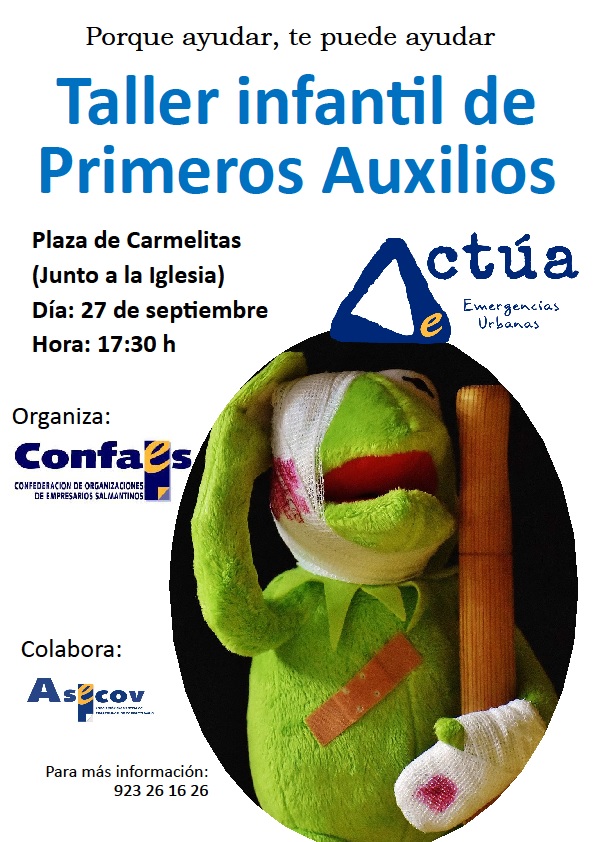 El Plan Actúa Emergencias Urbanas, impulsado desde la patronal CONFAES y la Asociación de Comercio ASECOV, organiza el próximo miércoles, 27 de septiembre, a las 17.30 horas, un “Taller infantil de primeros auxilios”, dirigido a ofrecer información a las familias sobre cómo actuar ante los accidentes básicos que pueden ocurrir en el día a día.
