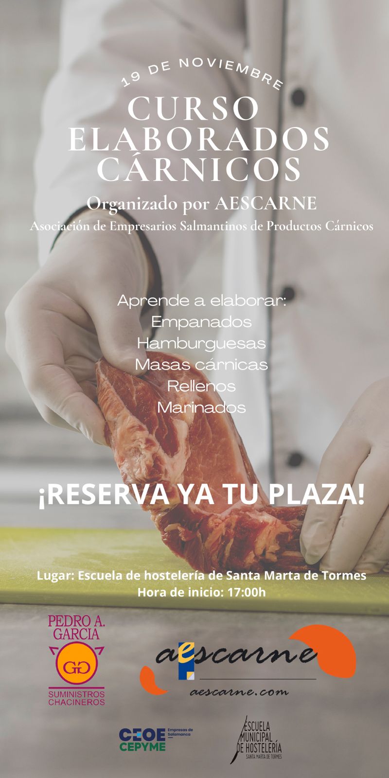 La sesión, que se celebrará el martes 19 de noviembre a las 17:00 horas en la Escuela de Hostelería de Santa Marta de Tormes, está organizada por Pedro A. García (Suministros Chacineros) y AESCARNE, con la colaboración de CEOE CEPYME Salamanca y la propia escuela.