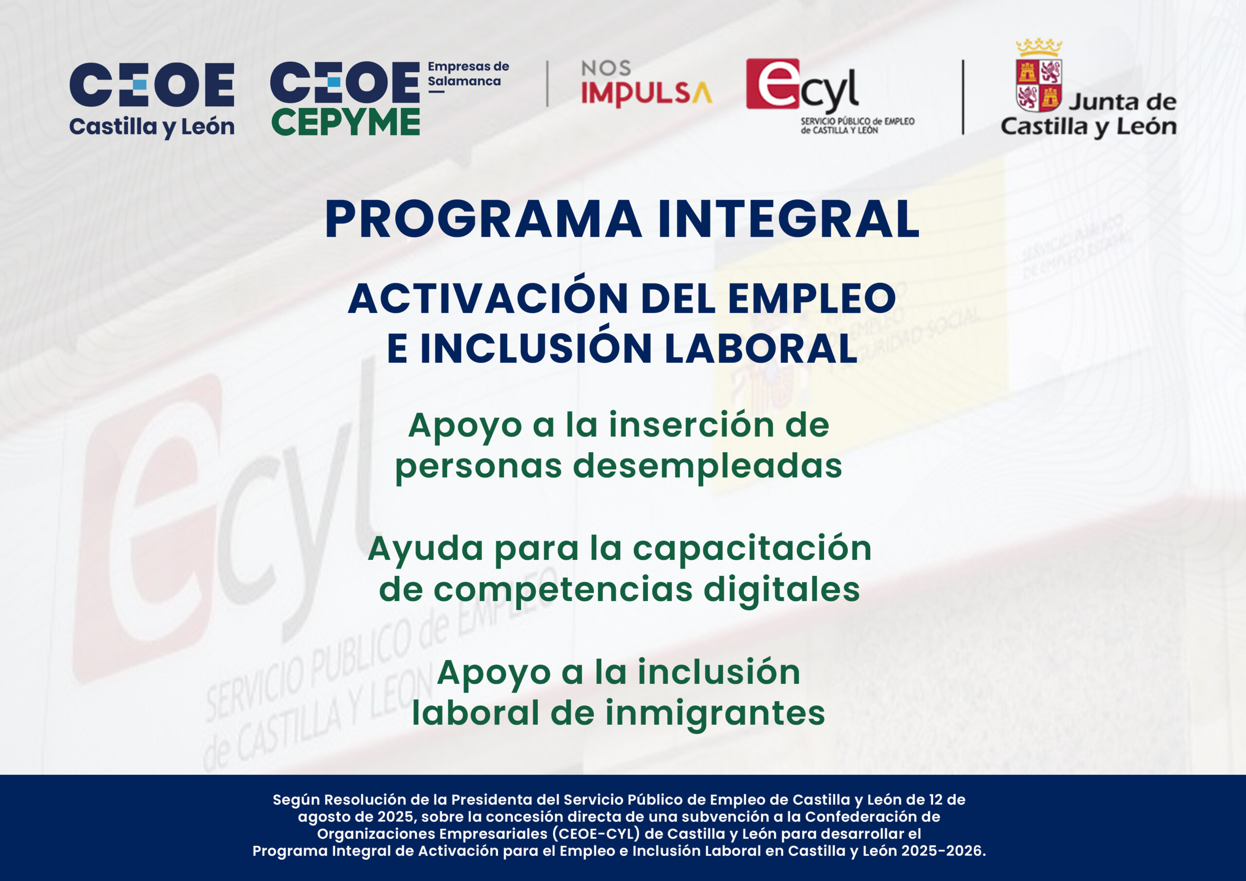 CEOE CEPYME Salamanca ha puesto en marcha el Programa Integral de Activación del Empleo e Inclusión Laboral en Castilla y León, una iniciativa gratuita, impulsada desde el ECyL en colaboración con la Junta de Castilla y León, dirigida a personas inscritas como demandantes de empleo, cuyo objetivo es mejorar de forma efectiva la empleabilidad, reforzar competencias profesionales y facilitar procesos de inserción laboral en toda la provincia.
